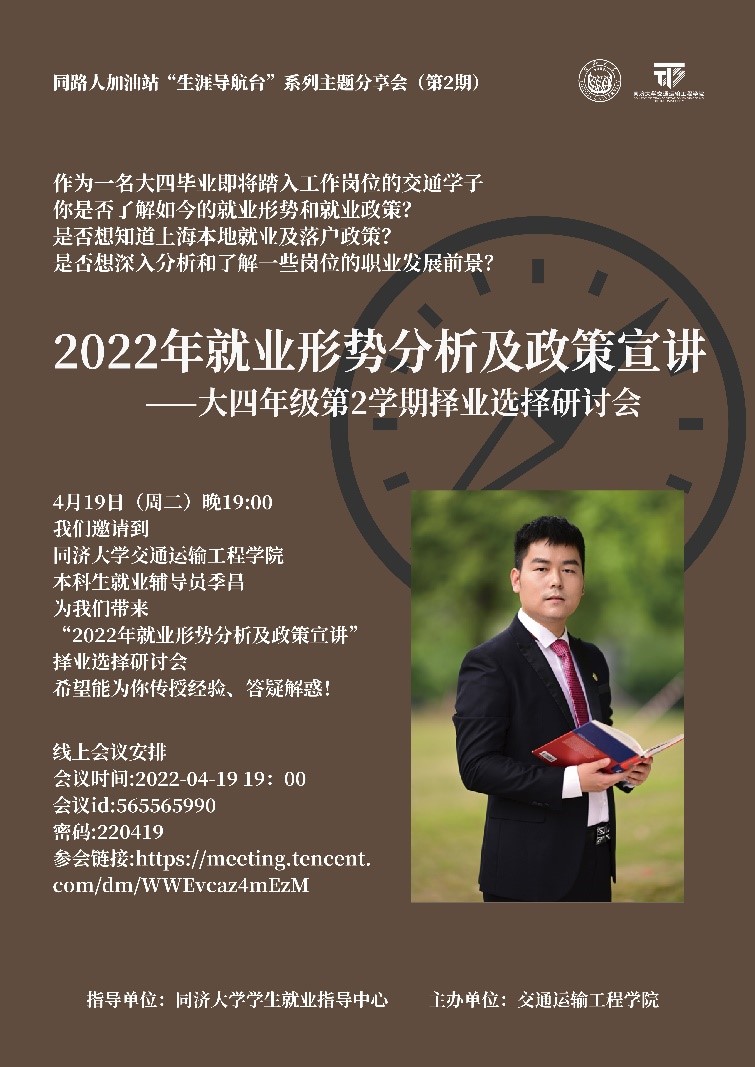为解答同学们在当前就业形势、就业政策、上海本地就业及落户政策等方面的疑问,4月19日19时,同路人加油站“生涯导航台”系列主题分享会第2期,邀请公司本科生就业辅导员季昌做题为“2022年就业形势分析及政策宣讲”的分享。